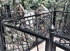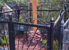Могила стандартная, не большая. Когда-то здесь стоял гранитный памятник и была высокая ограда. После очередного захоронения плиту убрали в сторону, цветник тоже подняли, переднюю часть ограду демонтировали, установили временный крест.